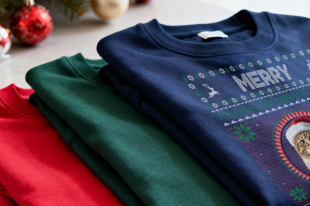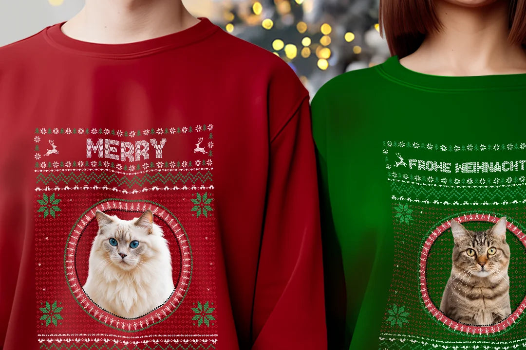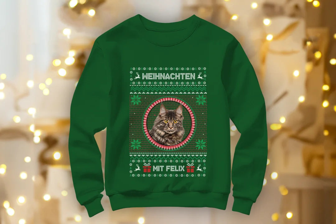 Verewige deine Katze auf einem einzigartigen Weihnachtspullover. Lade einfach das süßeste Foto deines Lieblings hoch und füge einen persönlichen Text hinzu, um ein unvergessliches Einzelstück zu kreieren.