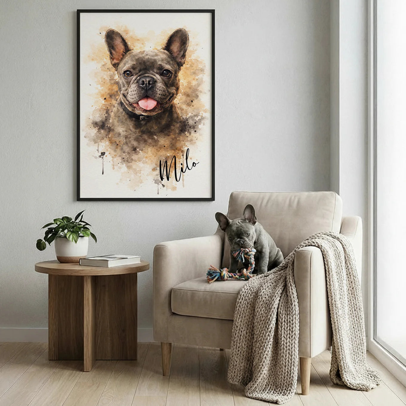 Wähle zwischen verschiedenen Größen und Hintergrundfarben und lade dein Lieblingsfoto hoch – wir verwandeln es in ein einzigartiges Kunstwerk. Ob 1 oder 2 Haustiere: Dein tierischer Begleiter wird in einem stilvollen, handillustrierten Design dargestellt, inklusive Name auf Wunsch.