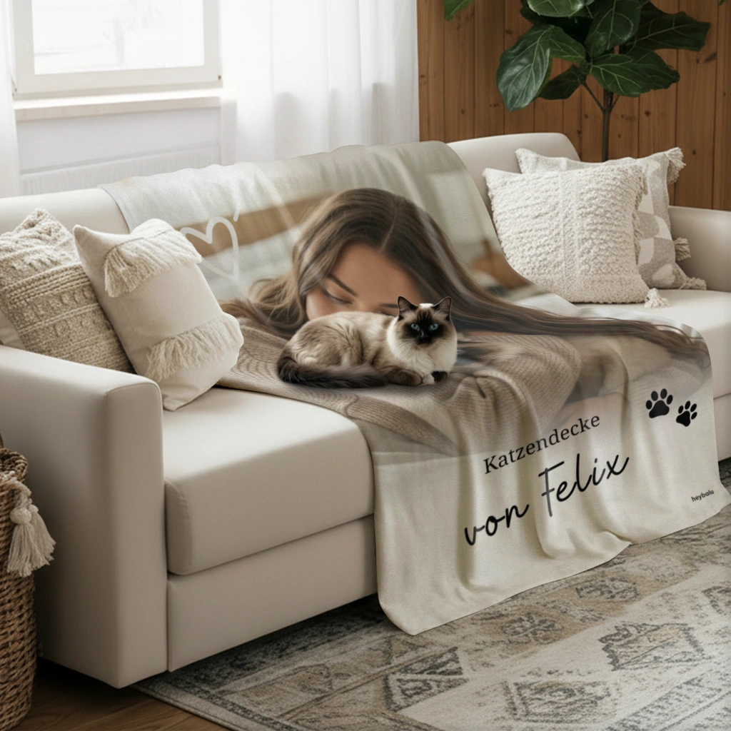 Diese personalisierte Kuscheldecke ist ein ideales Geschenk für jeden Katzenliebhaber. Ob Geburtstag, Weihnachten oder einfach so – bereite jemandem eine Freude mit einem einzigartigen und durchdachten Geschenk.
