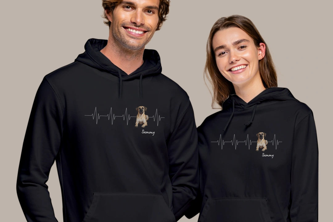 Du lädst einfach ein Foto deines Haustiers hoch, wählst den Namen und schon entsteht dein ganz persönlicher Herzschlag-Hoodie. Jedes Design wird mit Sorgfalt und Liebe zum Detail erstellt – egal ob Hund, Katze oder ein anderes Fellnäschen.