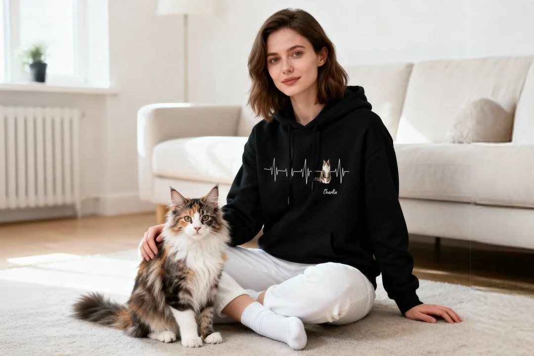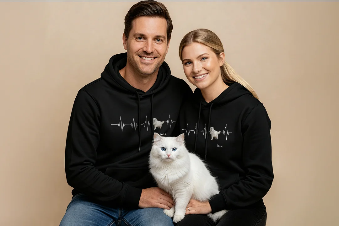 Mit diesem einzigartigen Hoodie trägst du dein geliebtes Haustier immer bei dir – als Herzschlag-Design mit Foto und Name deiner Katze. Der emotionale Print macht deutlich: Dieses Tier ist mehr als nur ein Haustier – es ist Familie.