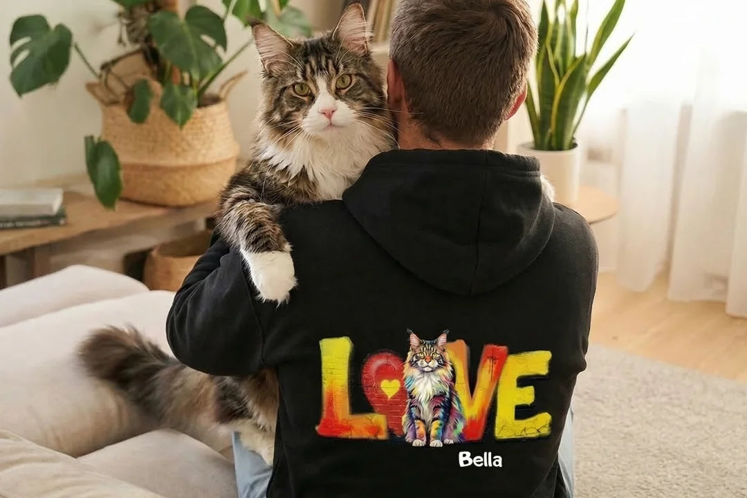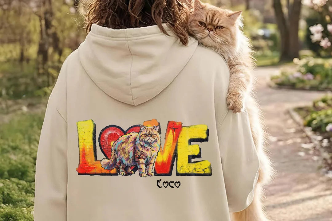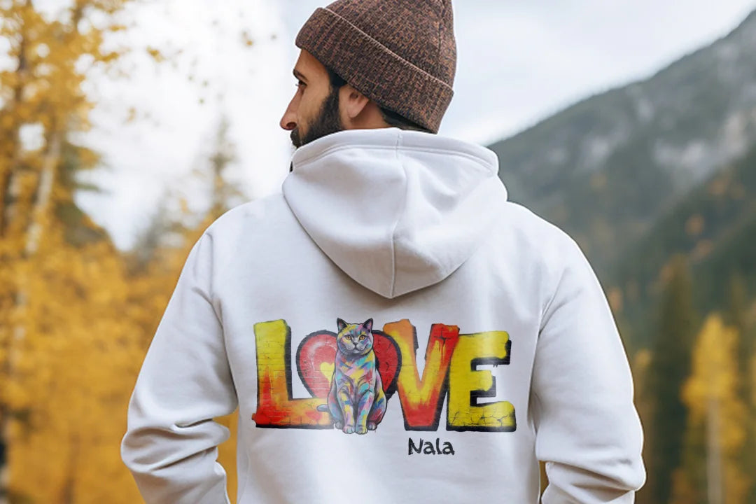 Mit diesem Hoodie wird deine Katze zum echten Blickfang. Dein hochgeladenes Foto wird kunstvoll bedruckt und in das farbenfrohe LOVE-Design integriert. So trägst du deine Katze immer bei dir – als einzigartiges Kleidungsstück voller Persönlichkeit und Tierliebe.