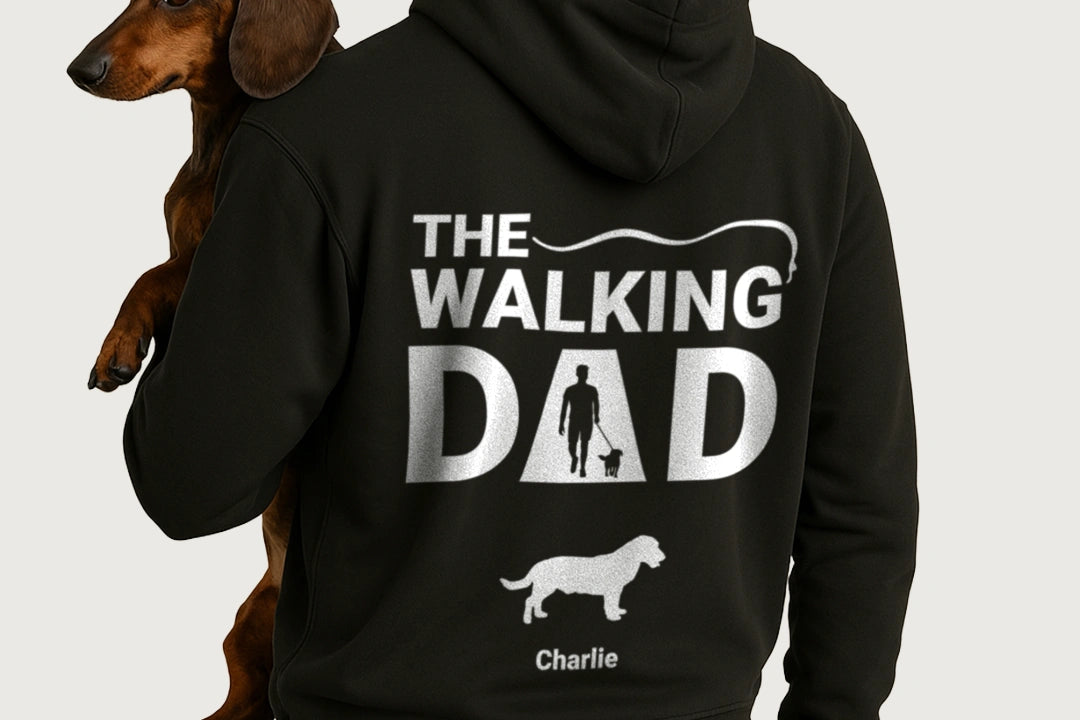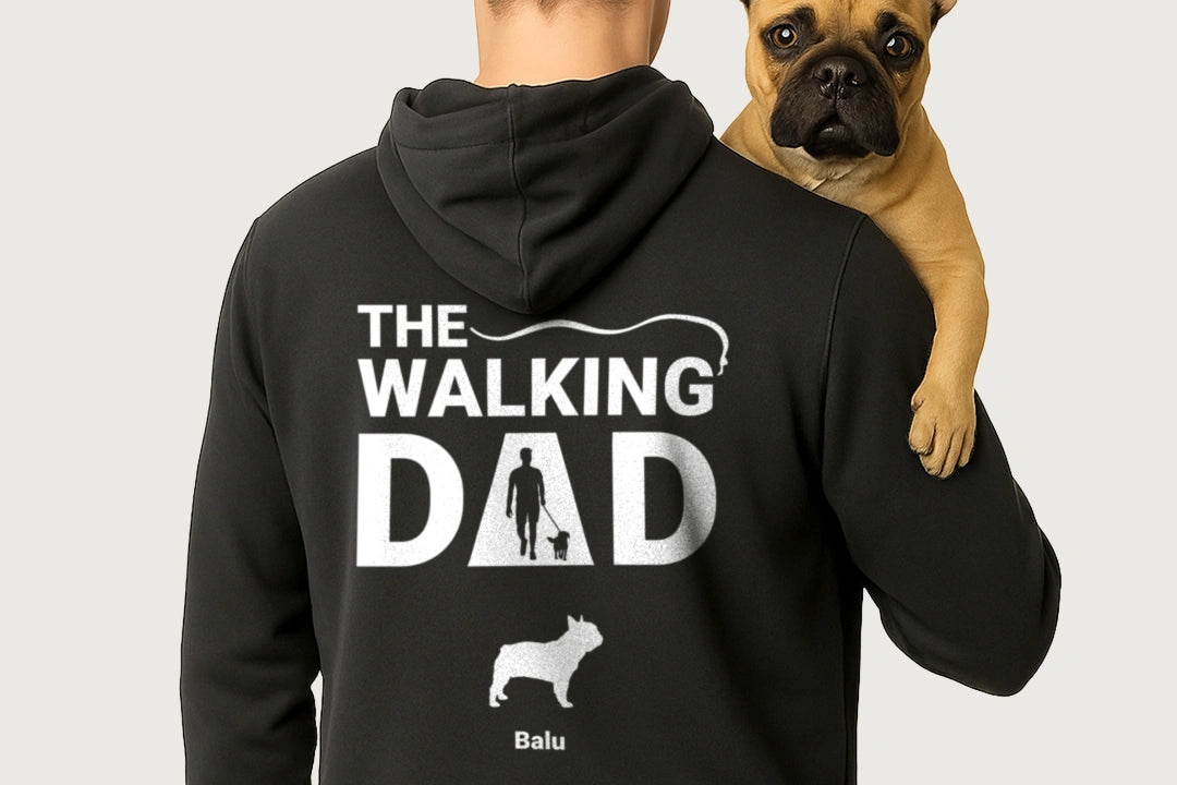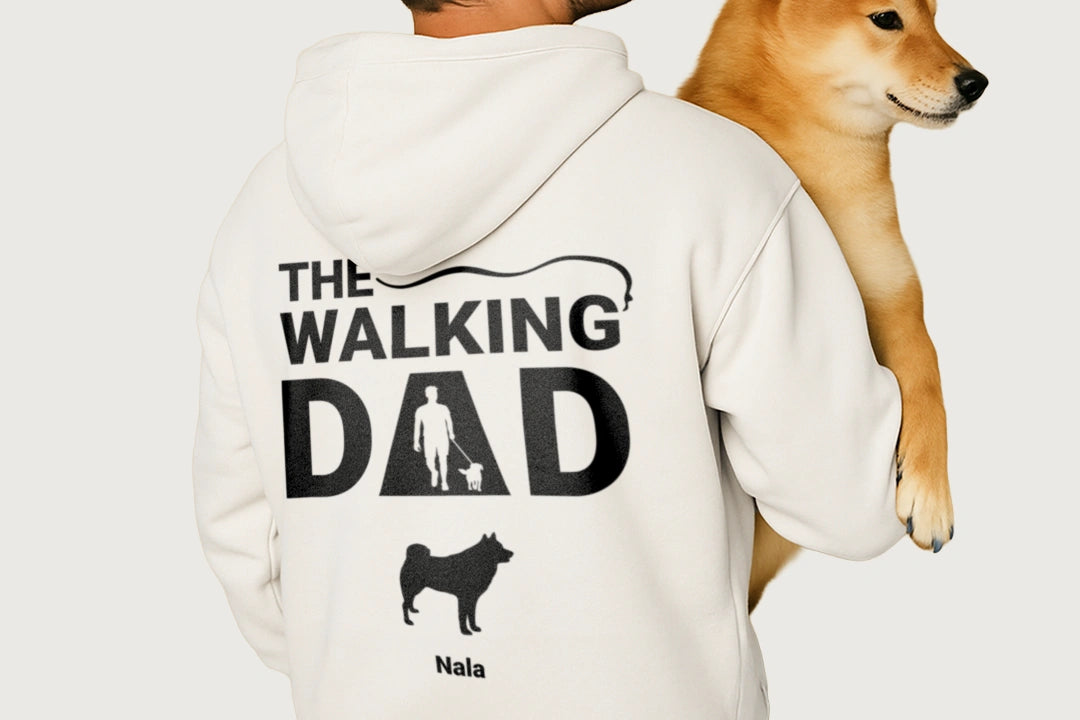 Mit dem humorvollen "The Walking Dad"-Aufdruck zeigst du der ganzen Welt auf sympathische Weise, wer dein ständiger Begleiter bei allen Abenteuern ist. Dieser Hoodie ist die perfekte Hommage an die unzähligen Spaziergänge, die gemeinsamen Erlebnisse und die bedingungslose Liebe zwischen dir und deinem Hund. Er ist das ideale Geschenk für jeden stolzen Hundepapa.