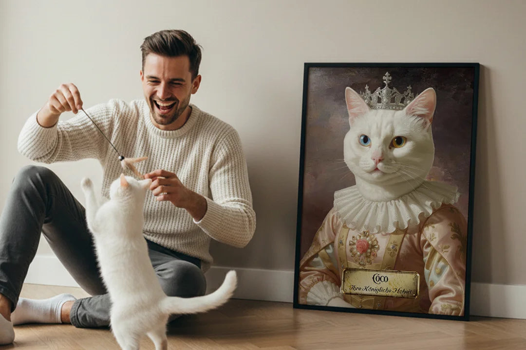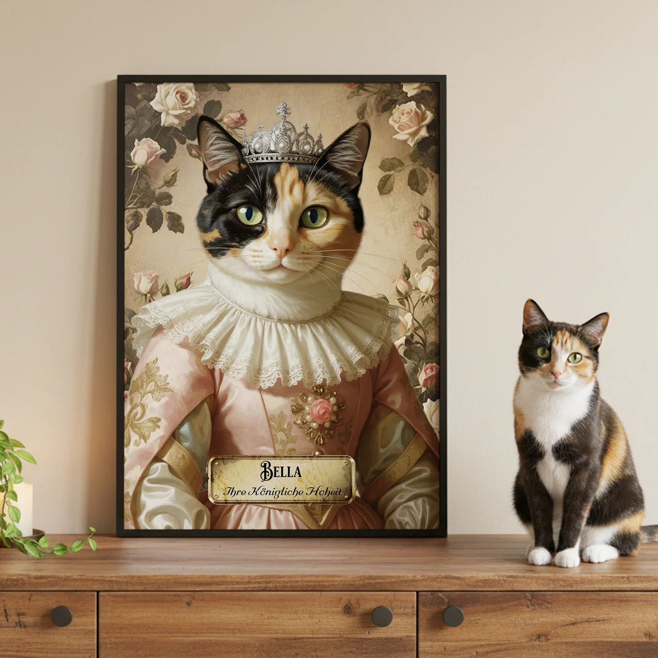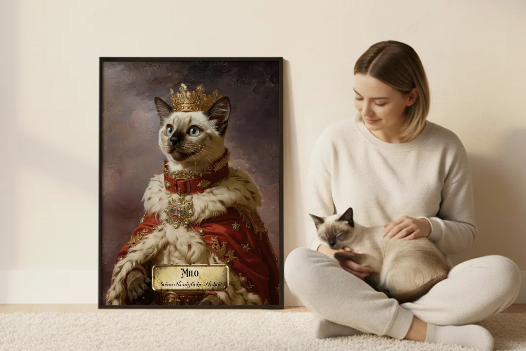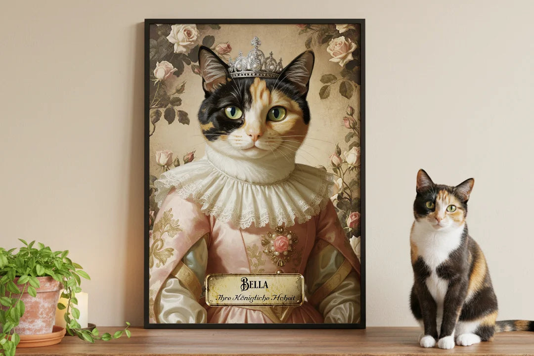 Verwandle deine Katze in ein königliches Kunstwerk. Das personalisierte Katzenposter wird hochwertig bedruckt und zeigt deinen Liebling in majestätischem Stil – mit Krone, edler Kleidung und Namen. Ein echtes Statement voller Stolz und Liebe.
