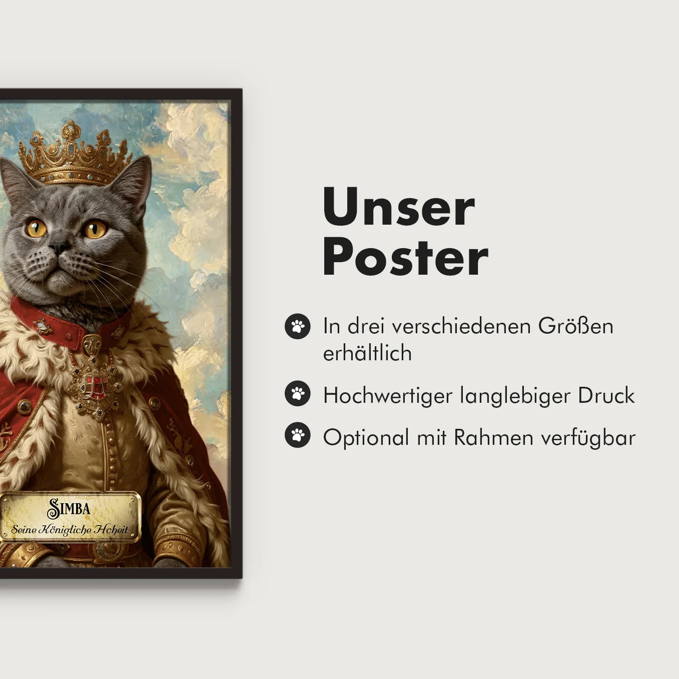 Jedes Poster wird individuell bedruckt und exakt auf das Foto deiner Katze abgestimmt. Gesichtszüge, Fellfarbe und Ausdruck bleiben erhalten – kombiniert mit einem royalem Design, das deine Katze als wahre Hoheit verewigt.