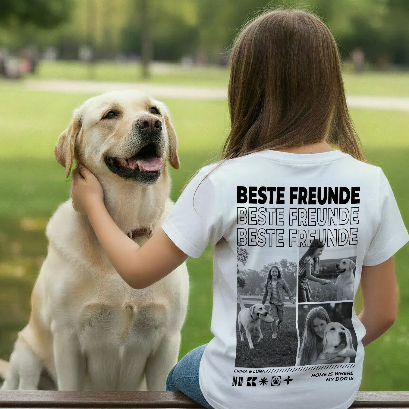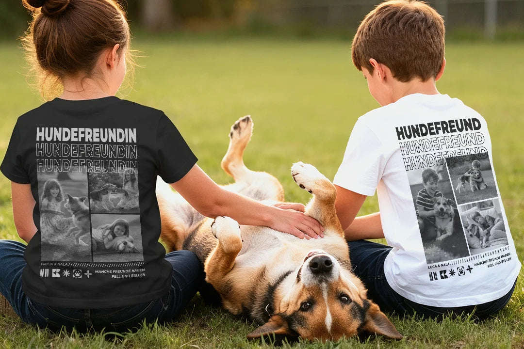Mit dem personalisierten Kinder T-Shirt "Hundefreund" wird die besondere Bindung zwischen deinem Kind und seinem tierischen Freund sichtbar. Drei, fünf oder sogar acht Fotos verwandeln das Shirt in eine liebevolle Erinnerung voller Emotion.
