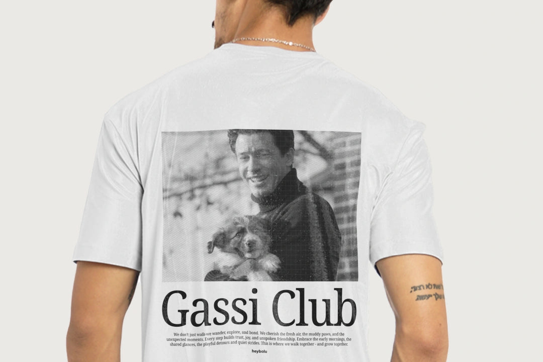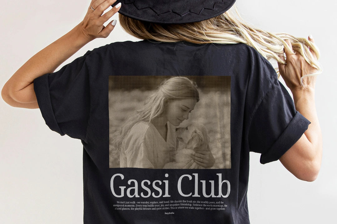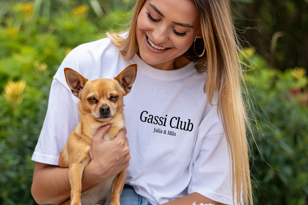 Das personalisierte Oversized Shirt im Retro-Stil bringt euren gemeinsamen Spaziergang auf ein ganz neues Level. Lade einfach ein Foto von dir und deinem Vierbeiner hoch, wähle euren Namen und schon wird das Shirt zum individuellen Highlight. Das „Gassi Club“-Design ist eine Hommage an eure Verbindung – für alle, die mehr als nur Gassi gehen.
