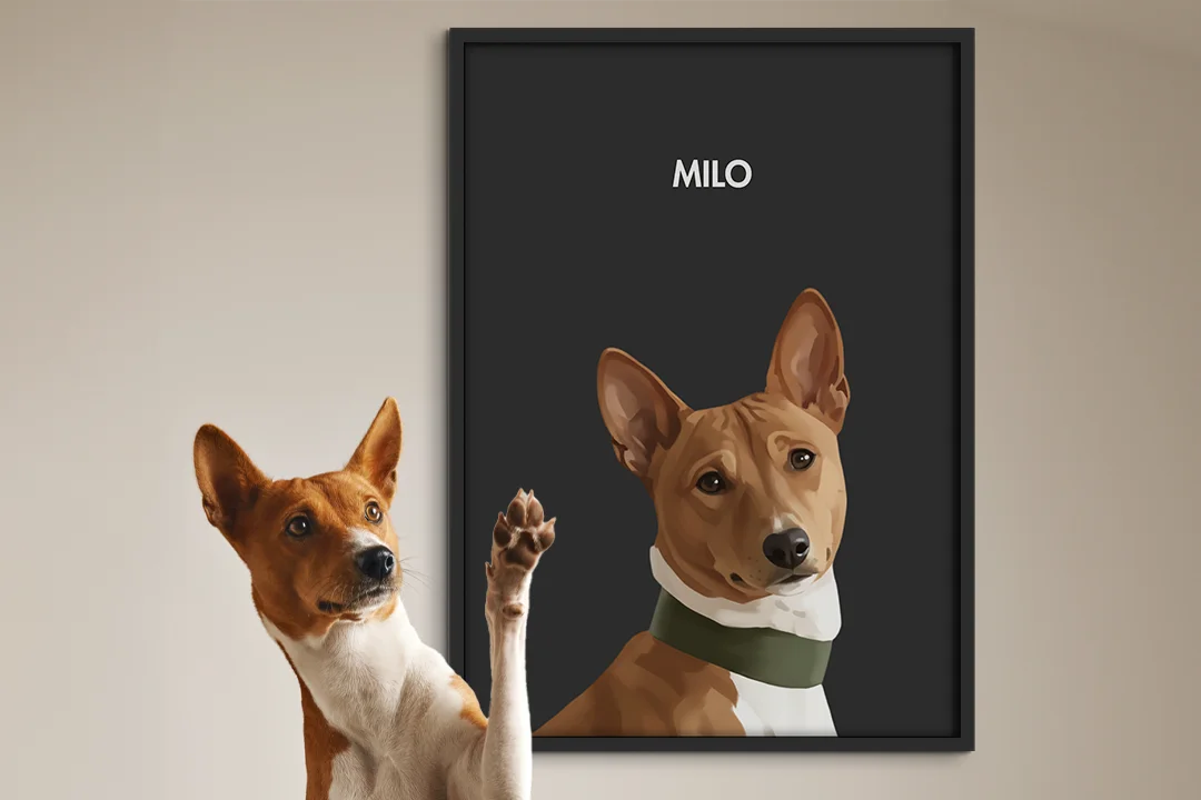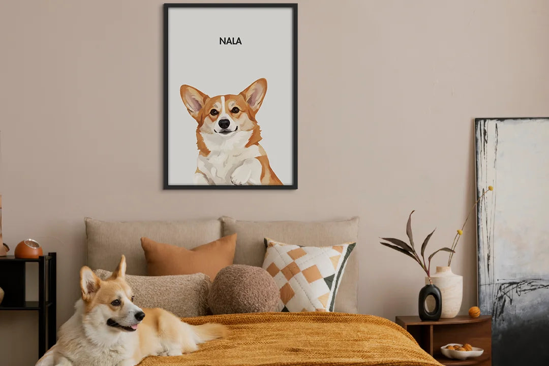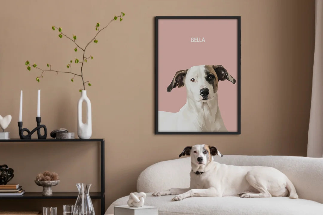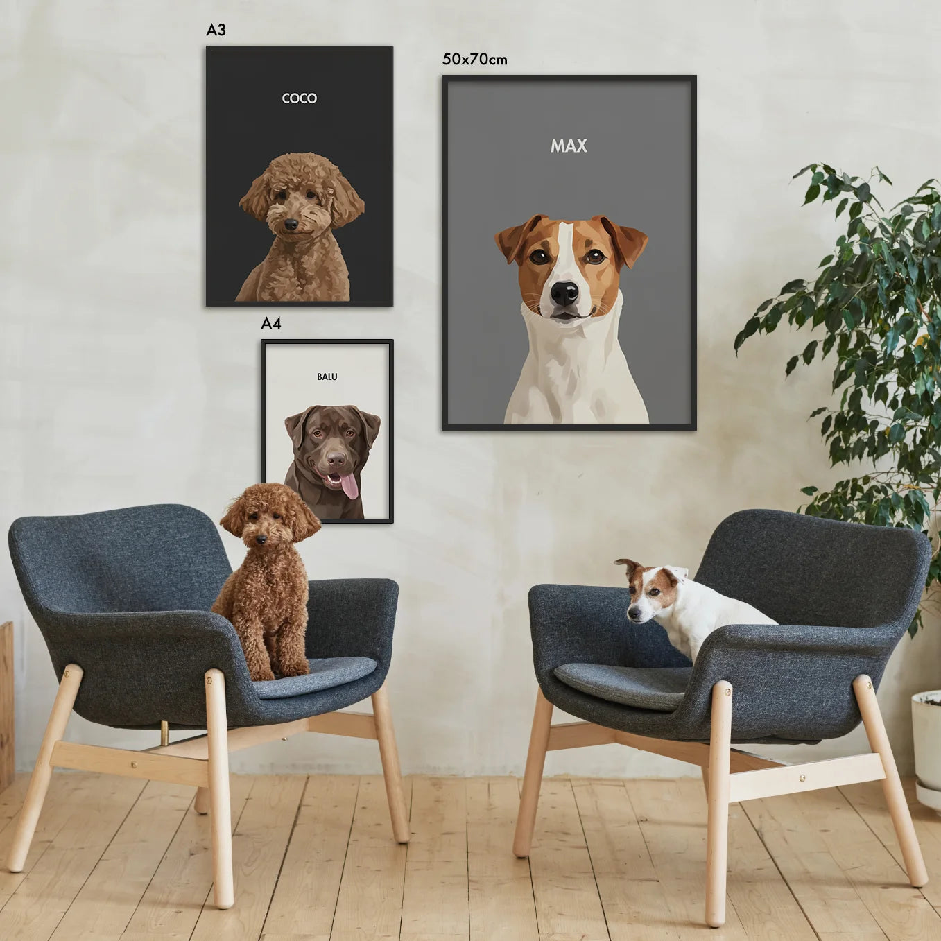 Das hochwertige Druckdesign fängt den Charakter deines Hundes detailreich ein. Name, Farben und Stil verschmelzen zu einem bedruckten Poster, das perfekt zu deinem Zuhause passt und deinen Lieblingsplatz noch wärmer macht.