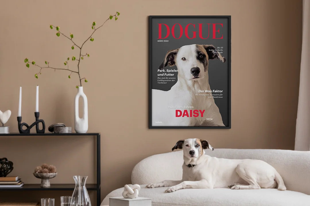 Mache den Hund eines geliebten Menschen zum Coverstar. Dieses "Dogue"-Magazinposter ist das perfekte, persönliche Geschenk und ein stilvoller Blickfang für das Zuhause des Beschenkten.