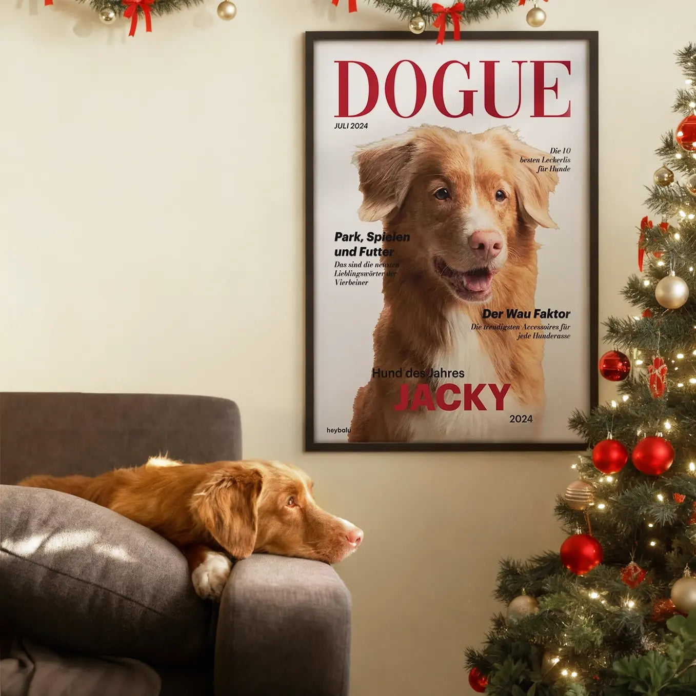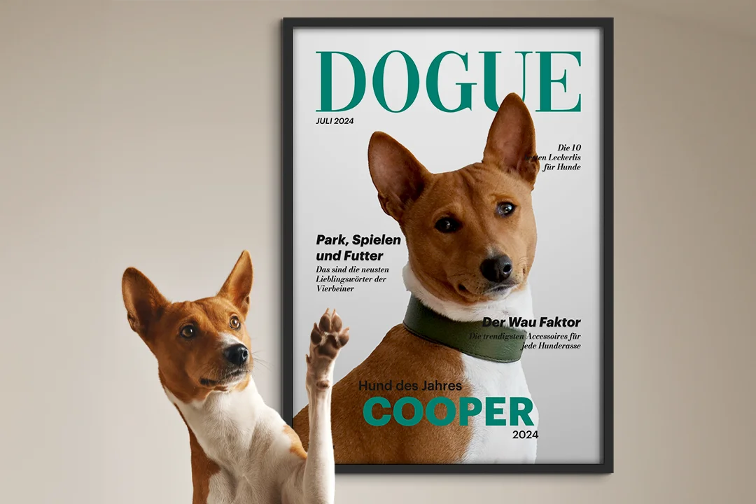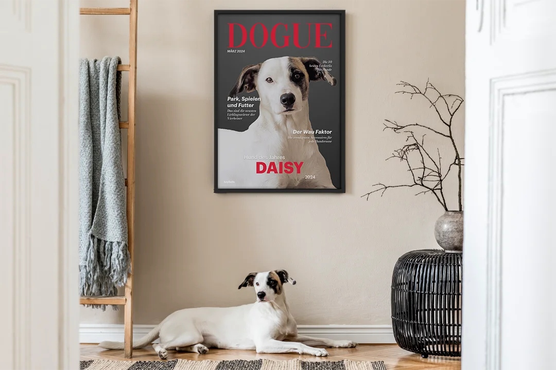 Gestalte das Poster ganz nach deinen Vorstellungen: Bestimme die Magazinüberschrift, füge den Namen deines Hundes hinzu und wähle das Jahr der "Ausgabe". Dein Haustier verdient es, im Rampenlicht zu stehen.
