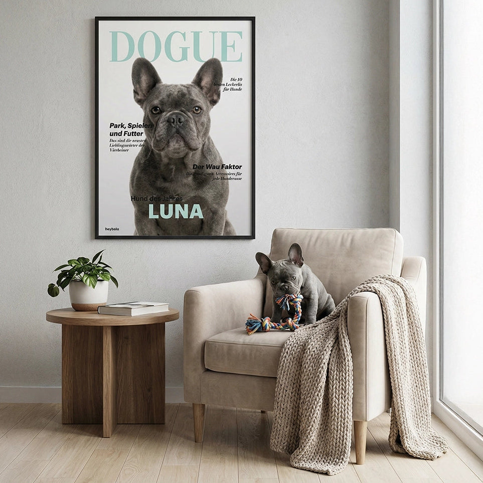 Mache den Hund eines geliebten Menschen zum Coverstar. Dieses "Dogue"-Magazinposter ist das perfekte, persönliche Geschenk und ein stilvoller Blickfang für das Zuhause des Beschenkten.