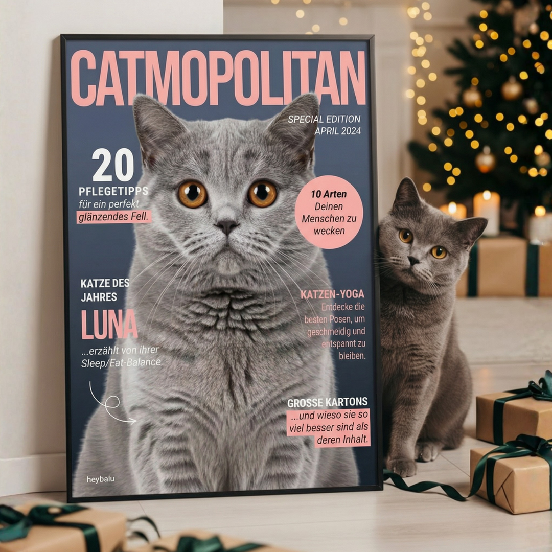 Gestalte das Poster ganz nach deinen Vorstellungen: Bestimme die Magazinüberschrift, füge den Namen deiner Katze hinzu und wähle das Jahr der "Ausgabe". Dein Haustier verdient es, im Rampenlicht zu stehen.