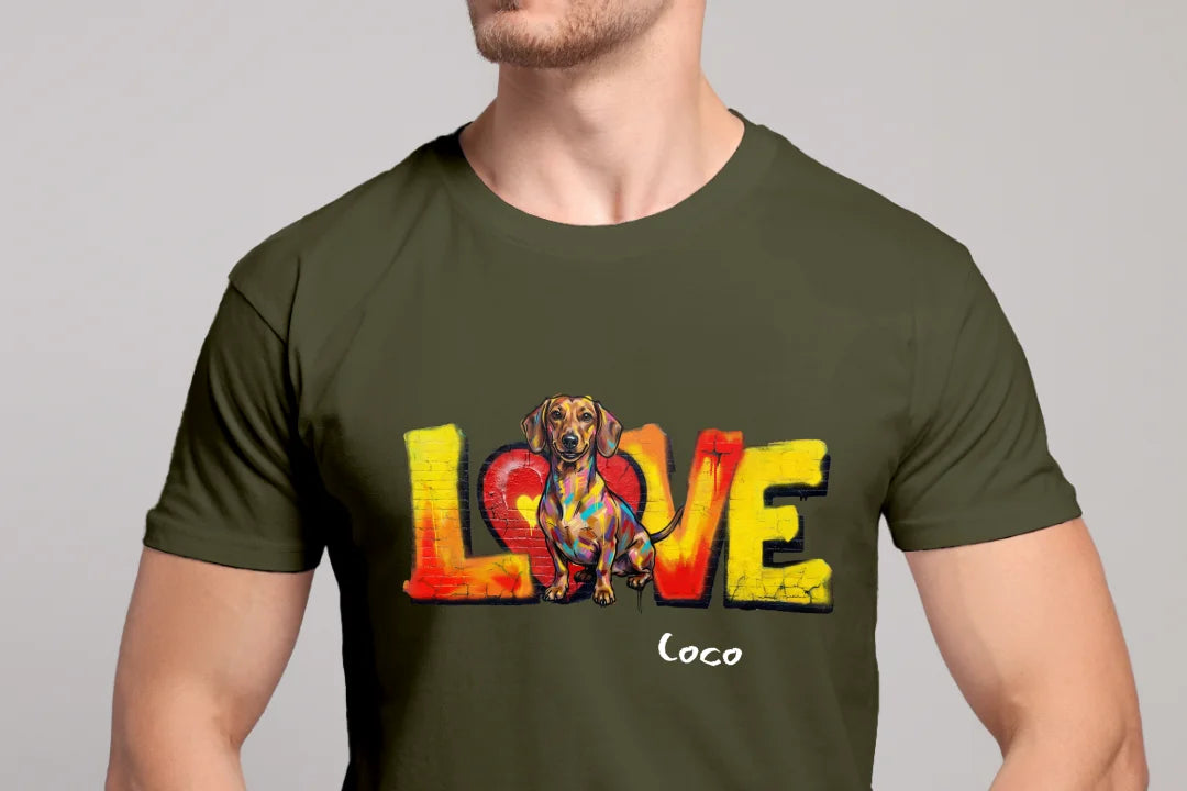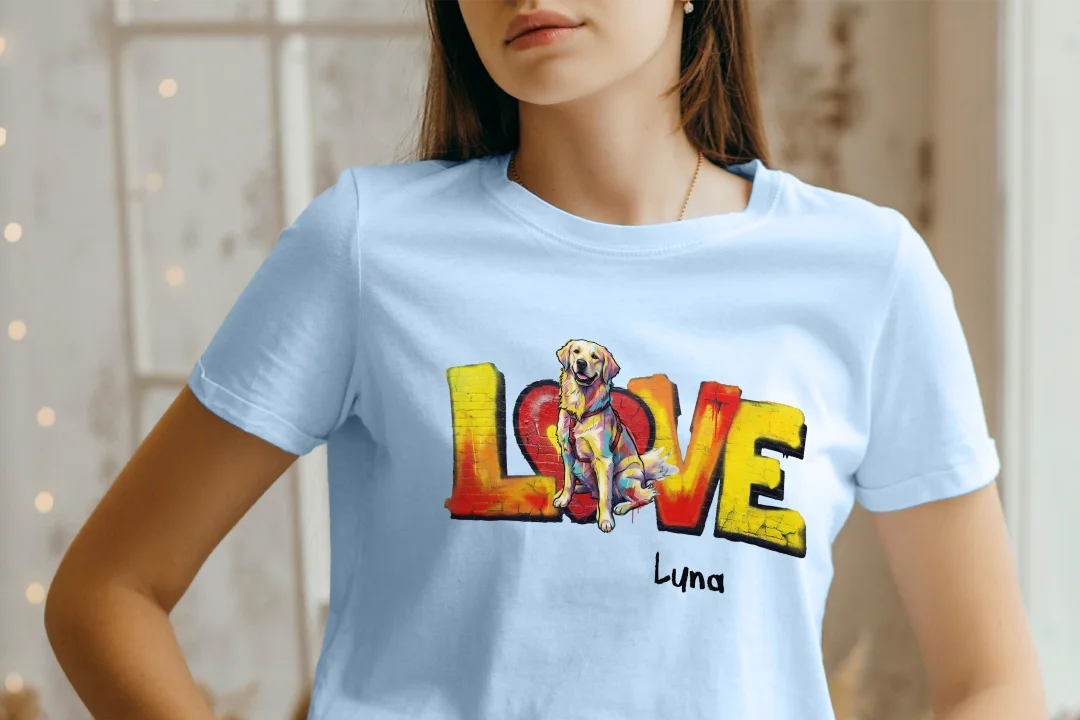 Mit diesem T-Shirt wird dein Hund zum Mittelpunkt deines Outfits. Dein hochgeladenes Foto wird kunstvoll bedruckt und in das farbenfrohe LOVE-Design integriert. So entsteht ein persönliches Kleidungsstück, das deine Tierliebe zeigt und deinen treuen Begleiter immer bei dir trägt.