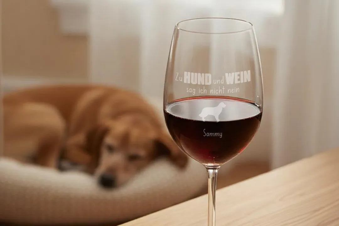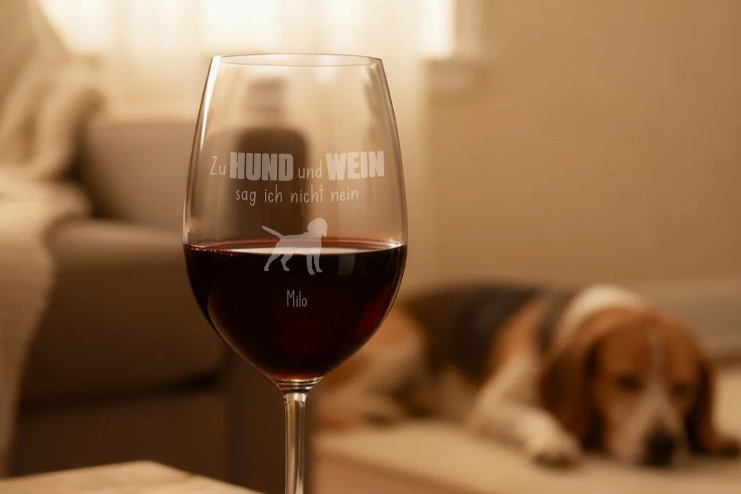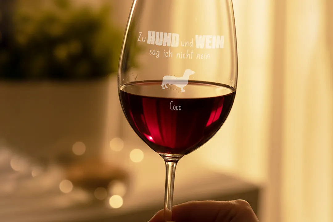 Mit dem personalisierten XXL Weinglas „Hund und Wein“ bringst du deine Liebe zu deinem Vierbeiner und einem guten Glas Wein stilvoll auf den Punkt. Die humorvolle Gravur „Zu Hund und Wein sag ich nicht nein“ sorgt garantiert für Lächeln – egal ob beim gemütlichen Abend auf dem Sofa oder als Geschenk für Hundefreunde.