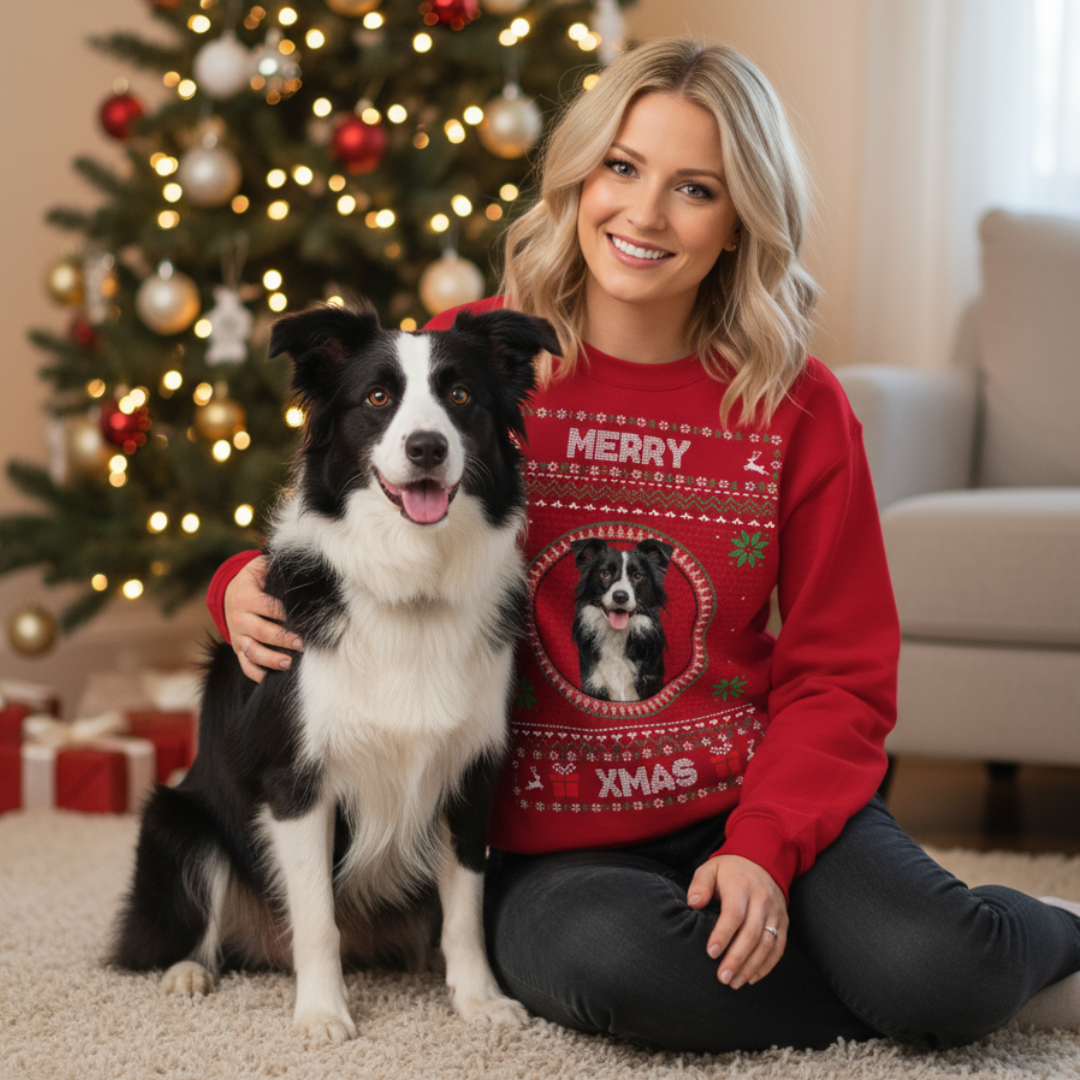 Gestalte deinen eigenen Christmas Sweater mit dem Foto deines Haustiers. Lade einfach ein Bild hoch, und der Kopf deines Lieblings wird automatisch ausgeschnitten. Perfekt für die Adventszeit!